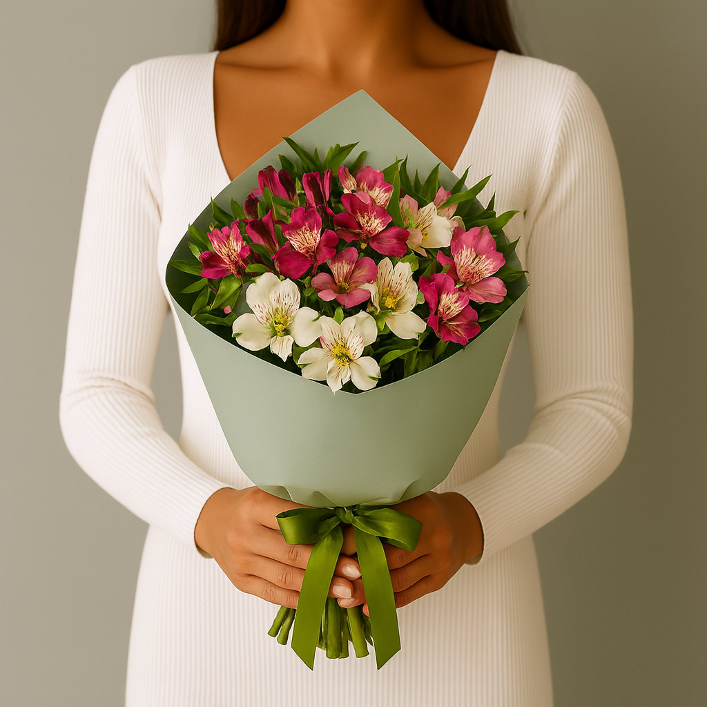 Стильный букет из альстромерий в белой упаковке с зелёной лентой. Глубокие фиолетовые и розовые оттенки цветов создают гармоничное настроение и прекрасно подойдут для подарка.