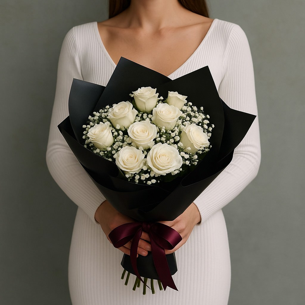 Изысканная композиция для тех, кто ценит стиль и минимализм. Контраст нежных белых роз и воздушной гипсофилы в обрамлении черной упаковки создает утонченное настроение. Такой букет подчеркнет особый статус и станет ярким акцентом любого события.