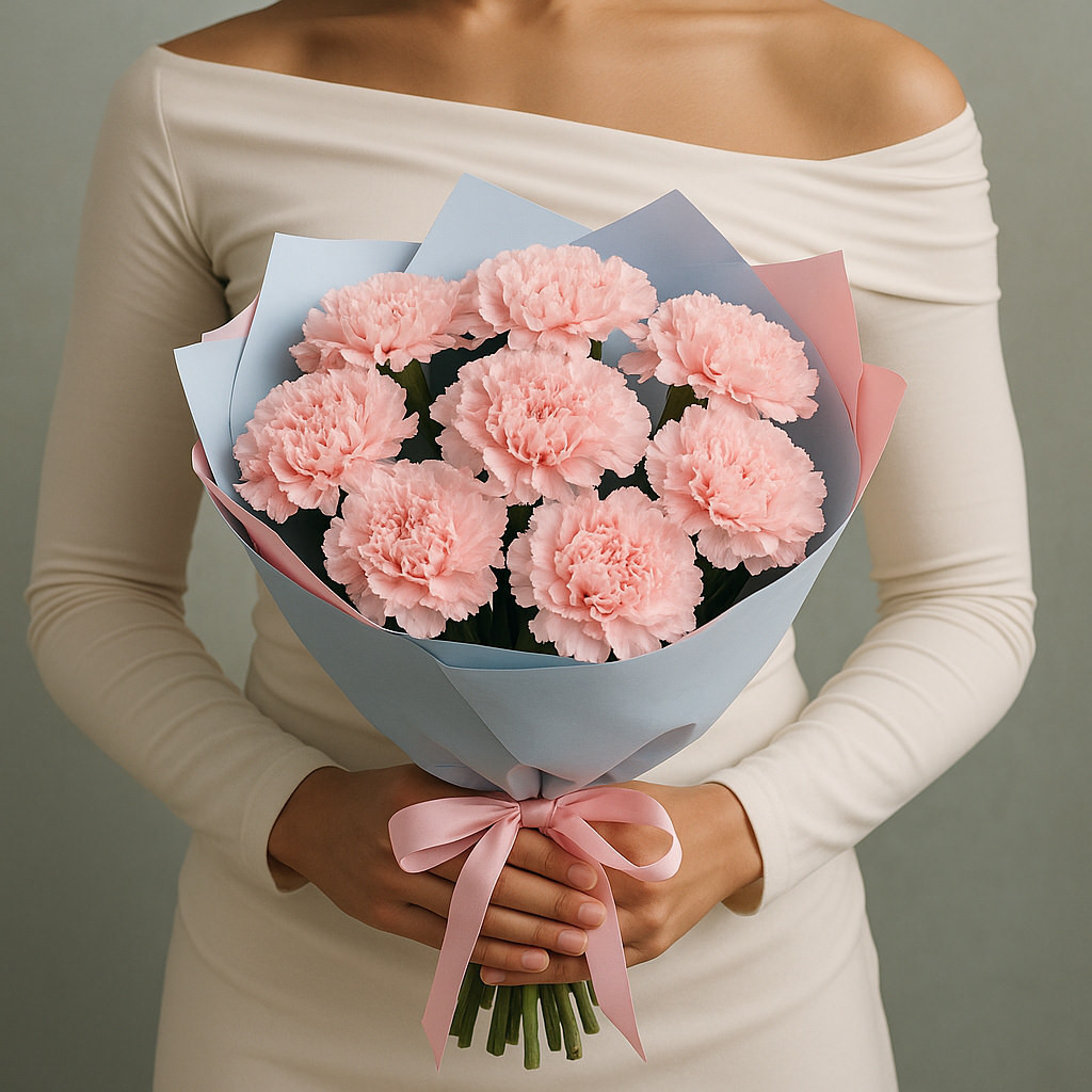 Нежный букет розовых гвоздик в пастельной упаковке — лёгкий, воздушный и очень романтичный. Идеален для признаний, поздравлений и тех моментов, когда хочется подарить тепло и заботу.