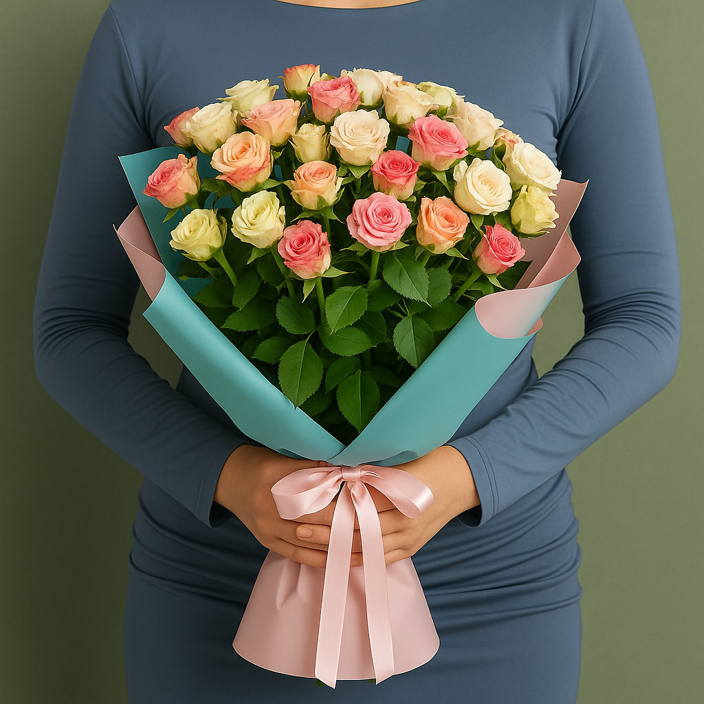Стильный и эффектный букет из кустовых роз в разных оттенках розового и кремового — символ нежности и радости. Отличный выбор для подарка на праздник, юбилей или признание в любви. Доставка по Москве и всей России.