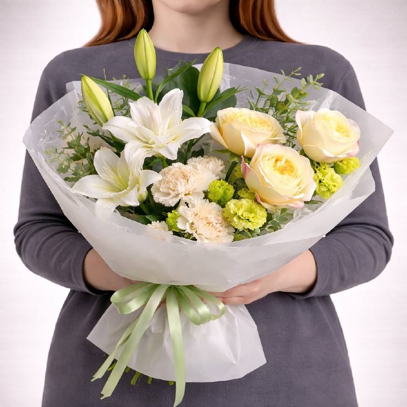 | Состав: | Гвоздики, Лилии, Пионовидные розы |