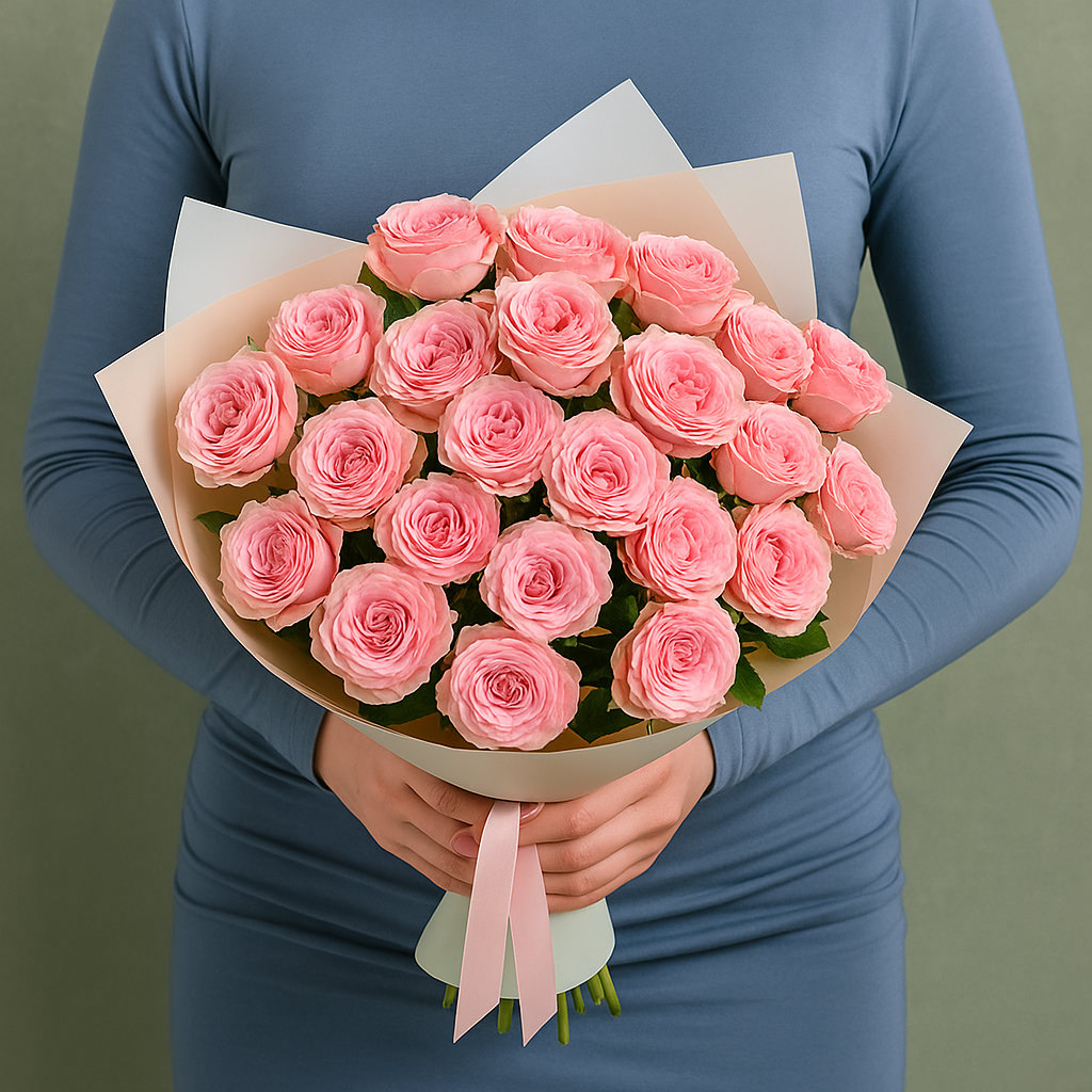 Очаровательный букет из нежно-розовых кустовых роз — символ искренности и заботы. Его воздушное оформление и гармоничные оттенки создают атмосферу утончённой романтики, которая покоряет с первого взгляда.
