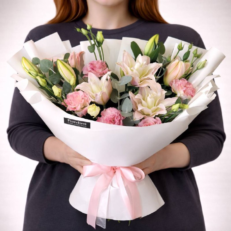 | Состав: | Гвоздики, Лилии, Розы, Эвкалипт, Эустомы |