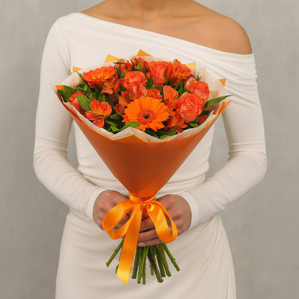 Стильный букет в ярко-оранжевой гамме — символ энергии, радости и позитива. Сочетание насыщенных оттенков и свежей зелени делает композицию выразительной и запоминающейся. Такой букет станет отличным подарком, чтобы удивить и порадовать близких.