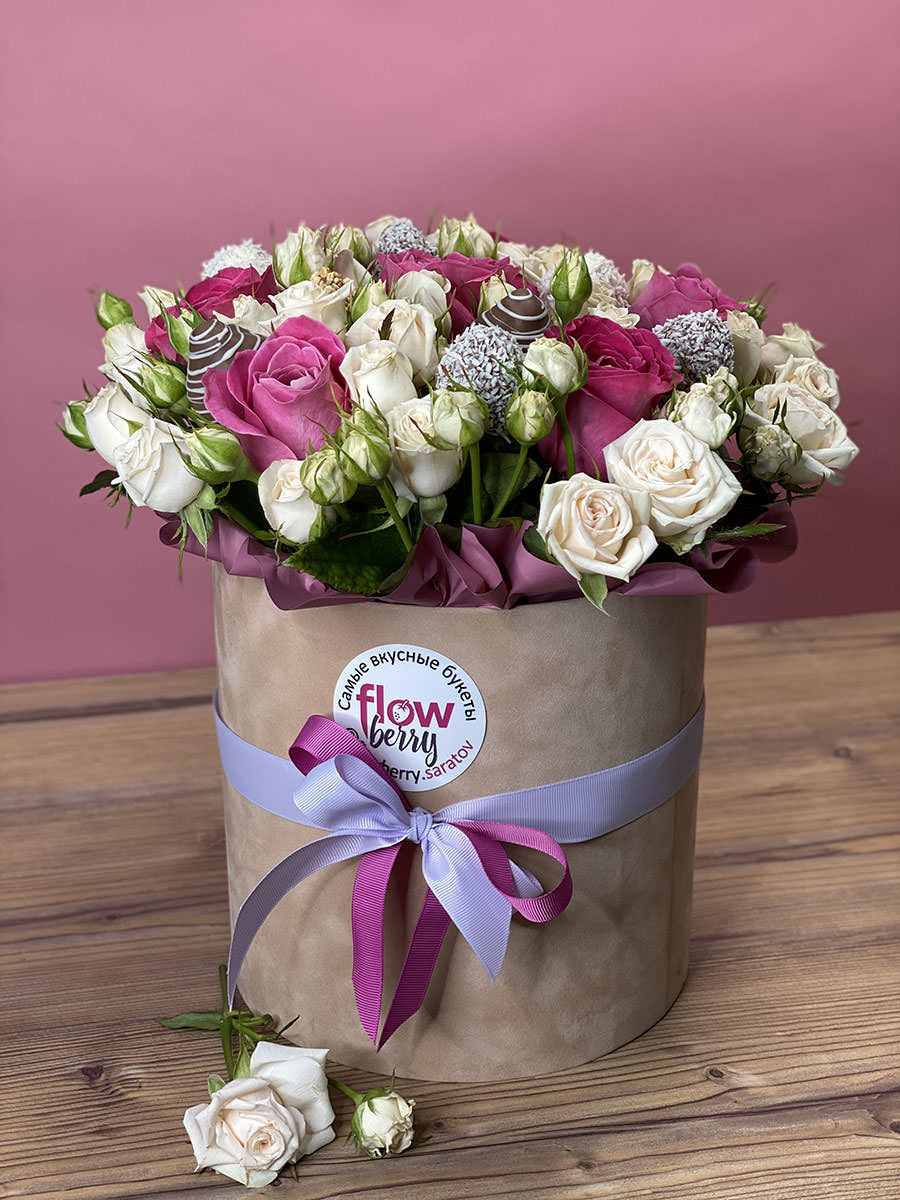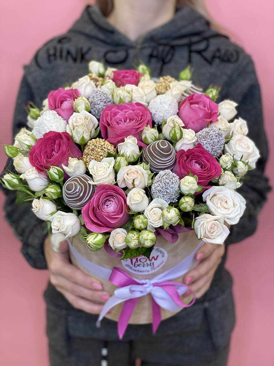 Шляпная коробка в шоколаде обращает на себя особое внимание своей необычной красотой и ароматной клубникой!
