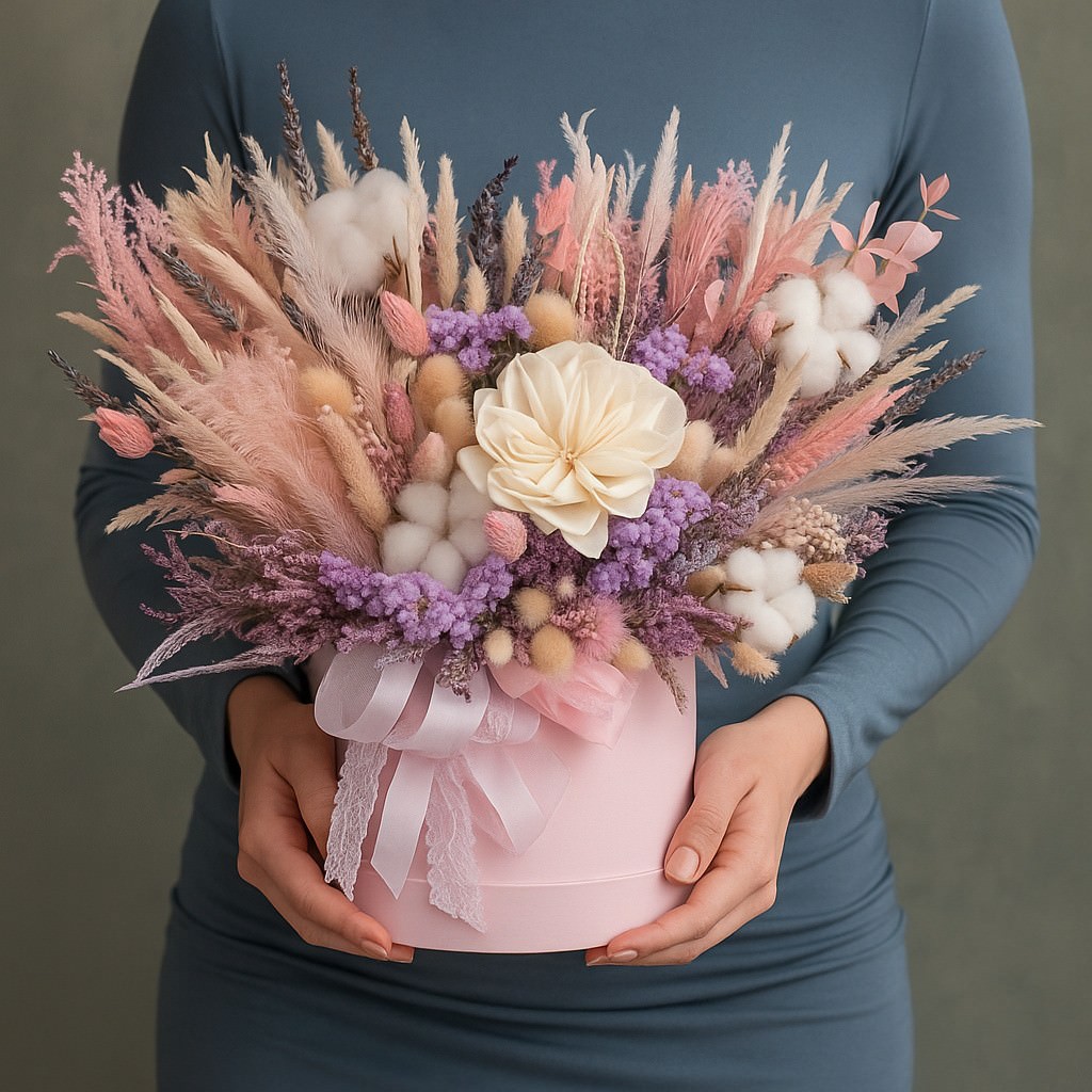 Элегантная композиция с сухоцветами, лавандой и хлопком. Изысканный подарок, который долго сохранит свою красоту.